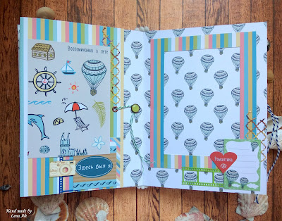 В нем 5 разворотов с местами для фото, кармашками для записей и конвертами для меморабилии.