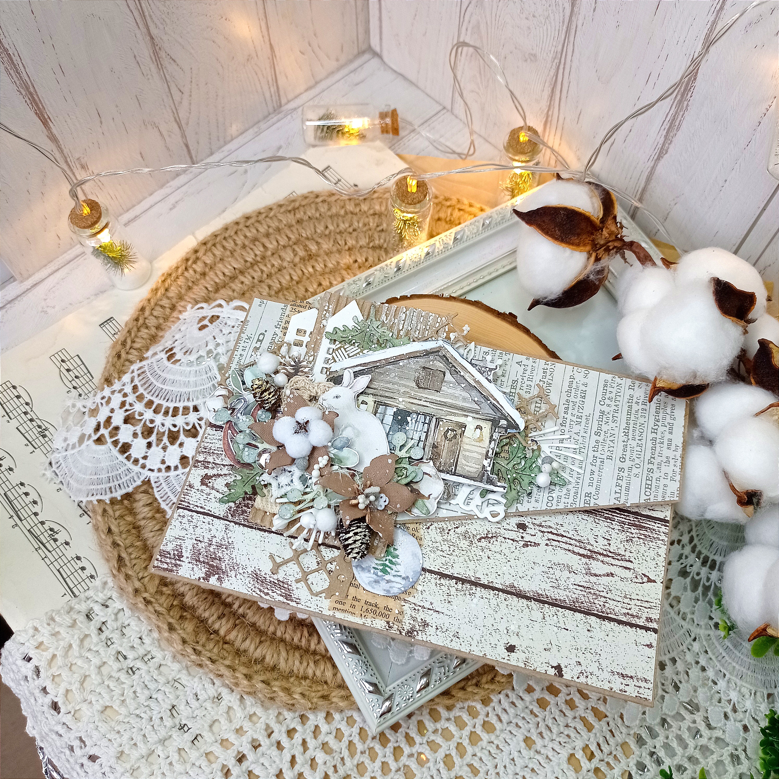 В работе я использовала коллекцию бумаги и вырезанные элементы от Dream Light Studio, тканевые цветки ручной работы и, новогоднюю вырубку.